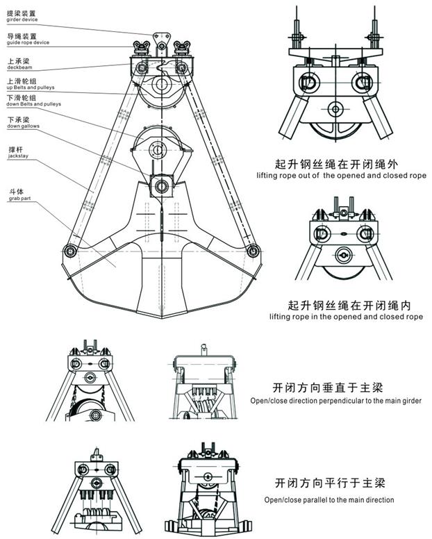 In alle soorten van de kraan met twee groep van motor durm (motor takel), elke groep motor durm leiden twee draad touwen, ze maken een groep draadkabels geroot in het balansframe voor de ondersteuning, een andere groep van draadkabel passeren de omhooggaande straal katrol en de down-beam katrol, composiet een katrolblok als open en dicht grijpbak.