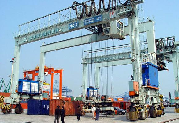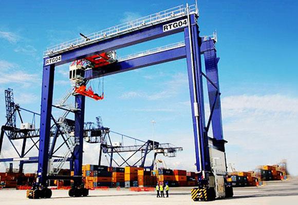 1. De portaalkraan met rubberbanden wordt meestal kortweg RTG genoemd, die wordt gebruikt om containers in containeropslagplaatsen te stapelen. De containerkraan met rubberen banden wordt flexibel verplaatst door zijn eigen rubberen banden voor het overladen van containers.